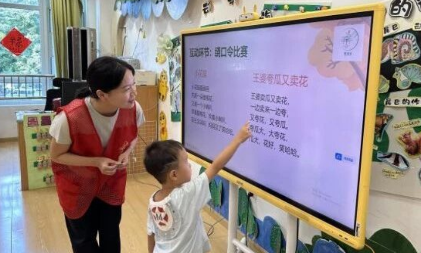 志愿者运用简单易懂的语言为孩子们介绍了普通话的基础知识、特点及其重要性,带读学唱推普五字歌,带领孩子们开展绕口令趣味练习,分享日常生活中如何运用普通话进行沟通的学习技巧。现场与孩子们互动模拟现实生活中用方言和普通话沟通的不同场景,将“吃饭了吗”等日常对话用武汉方言和普通话分别演绎,孩子们在欢笑声中直观感受语言差异。孩子们在轻松愉快的氛围中学到了如何正确发音,还体验到了说普通话的乐趣,深刻体会到普通话的魅力。