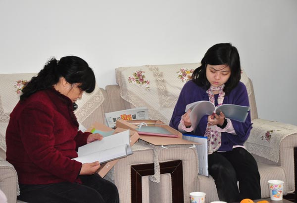 区爱卫会检查小组查看报社近年来卫生方面的各类档案资料。