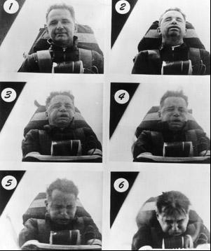 过山车俯冲而下时,我们会在很短的时间里承受5g重力加速度,这时我们会产生头晕恶心的感觉。座椅必须经过特殊设计,人们才不会晕过去。我们承受重力加速度的能力,不仅取决于加速度或减速度的变化和持续时间,而且取决于我们身体的方向。我们对朝脚的方向施加的外力最敏感,因为这使血液流向大脑。身体处于垂直状态在4到5g的环境下持续5到10秒,经常就会引起管状视,然后失去知觉。