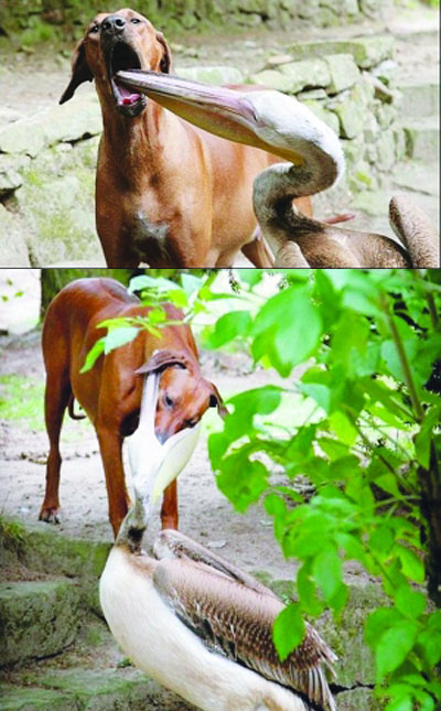 现年38岁的罗兰德·亚当是德国奥斯纳布吕克市附近一家珍稀鸟类农场的老板,他的农场中养着从鸵鸟到火烈鸟在内的各种各样的珍稀鸟类,其中包括一只名叫“皮特里”的一岁大鹈鹕。不久前,亚当试图给鹈鹕“皮特里”喂一块冷冻鸡肉时,没想到农场中的罗得西亚猎狗“卡蒂吉纳”突然冲了过来,从半空中一口夺走了亚当扔给鹈鹕“皮特里”的鸡肉。