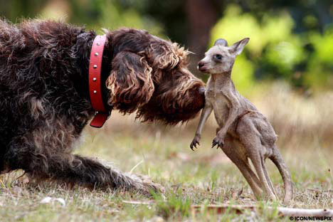 原来,雷克斯在死去的袋鼠育儿袋中发现了仅4个月大的小袋鼠。“很显然它闻到了死去袋鼠育儿袋内活着的小家伙的气味,并将它安全的带了回来。”据主人介绍,现在它们亲密无间,经常在一起玩耍。“小袋鼠经常依靠在雷克斯身上。”