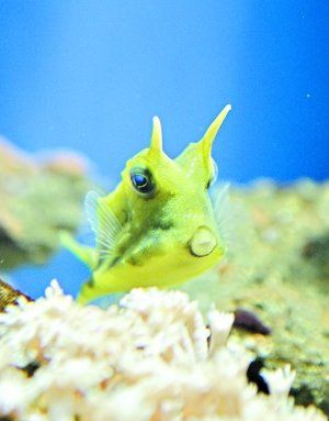 入住海底世界珍品缸的牛角箱鲀被誉为“水中金牛”,长相非常奇特。它不仅外貌与牛相似,连游姿也和牛的动作一样,特别缓慢。更有趣的是,牛角箱鲀就连脾气也很牛,一旦遭到进攻,就会从皮肤下分泌出一种有毒物质,将周围的鱼杀死,其中也包括它自己。