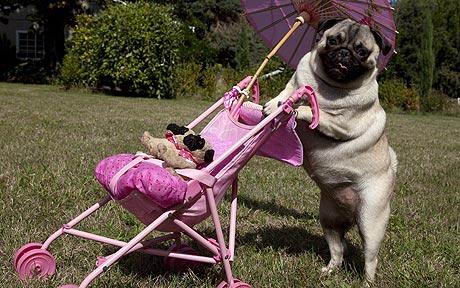 美国哈巴狗会用婴儿车带“狗宝宝”散步