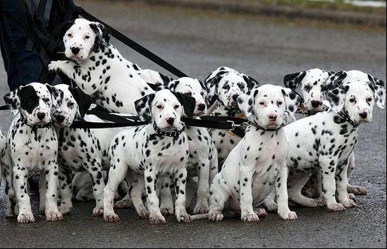 生活于英国莱斯特郡梅尔顿莫布雷地区的亚当-莫雷正牵着他的18条可爱的大麦町幼仔出来散步。大麦町也叫斑点狗,是一种中型短毛狗。它们一身白底黑点的漂亮外观特别引人注目。