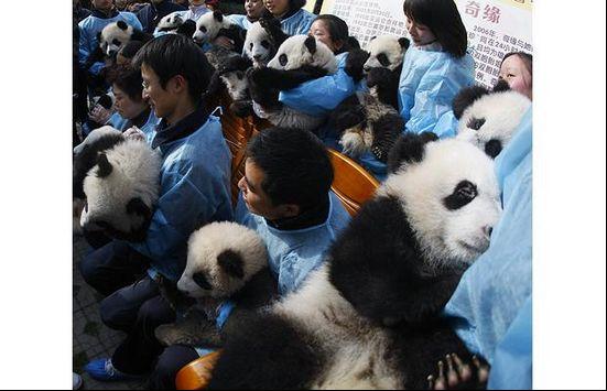 在中国成都大熊猫繁育研究基地,工作人员正抱着可爱的大熊猫宝宝拍一组全家福。