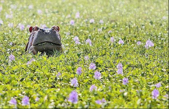 一只受到惊吓的河马正从藏身处蹿出。尽管河马算得上动物世界的大家伙,但是它们却是一种比较害羞的动物。