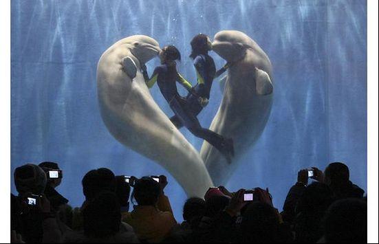 在中国黑龙江哈尔滨的一家水族馆中,两名训练员正在引导两头白鲸为观众表演节目。训练员和白鲸形成了一个心形结构。