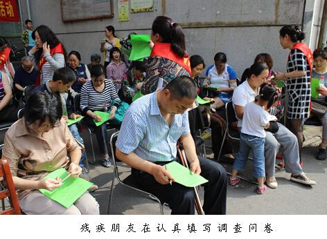 纺机社区工作人员和理工大学航运学院志愿者对参加活动的残疾人朋友一起发放调查问卷,认真填写,在循环播放歌曲《感恩的心》《祝您平安》《隐形的翅膀》“助残日”主持人和社区主任对参加和平街“全国助残日”的残疾朋友们送上小礼品,送上祝福,祝和平街全体残疾人朋友生活愉快,万事如意,一生平安。
