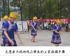 此次活动分三大板块:民族科普知识宣传讲解,民族舞蹈展演、科普讲解员招新。随着一声嘹亮的号子—“摆手咯”,志愿服务队的姑娘们身着亮丽的民族服装,踏着欢快的节奏,跳起了土家族传统舞蹈——”摆手舞“。整齐的步伐,动感的舞姿吸引了众多观众驻足观看和拍照,现场气氛十分热烈;随后,志愿者任家萱为观众献上了一支蒙古族的传统舞蹈——”顶碗舞“,她优美的舞姿博得现场观众的阵阵好评与掌声。志愿者李蜜也为观众献唱了一曲铿锵大气的豫剧——《谁说女子不如男》,她精湛的唱功,令人啧啧称叹。据悉,为丰富民族科技文化宣传形式,自本学期开学以来,博物馆组织志愿者集中学习民族舞蹈,土家摆手舞是其中之一,经过姑娘们的刻苦训练,首次公开亮相的民族舞蹈艺术立刻征服了全场!