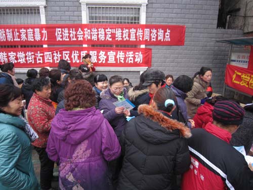 市科协网讯 3月5日上午,虽然天气严寒,韩家墩街古四社区户外广场却热闹非凡,人海如潮,韩家墩街办事处在此举办了“爱心传递你我他,巾帼情暖千万家”和“预防制止家庭暴力,促进社会和谐稳定”主题宣传教育活动,近千人参加了活动。