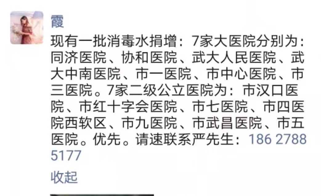 2月1日,区科协通过朋友圈信息了解到有爱心人士可为医院提供消毒水,又积极联系该爱心人士确认消息属实后,立即与辖区内协和医院和协和红十字会医院联系,帮忙协调。