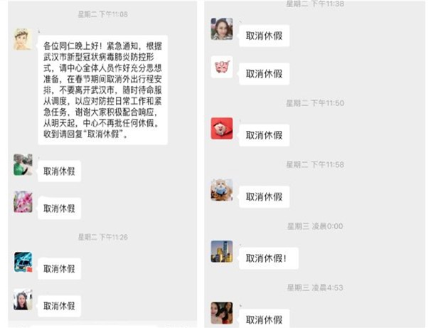 2020年1月21日深夜11时,一张截图在朋友圈传播开来,这是满春街社区卫生服务中心工会群,中心院长胡岚往群里发了一句:“请大家取消春节期间外出旅行计划,收到请回复,取消休假”。下面一排全是回答:取消休假,任何时间服从安排!大家毫不犹豫的加入了疫情救治的队伍中来,誓死打赢胜仗,保卫老百姓的健康!