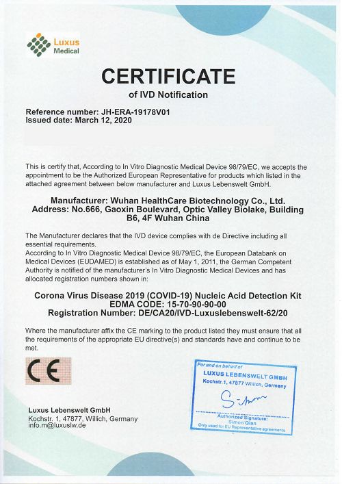 3月13日,武汉明德生物科技股份有限公司新型冠状病毒核酸检测试剂盒、核酸提取试剂、新型冠状病毒IgM/IgG抗体检测试剂盒(胶体金法)、血气分析仪、血气检测试剂盒、高敏C反应蛋白(hs-CRP)检测试剂盒共6个产品获得欧盟CE准入,拥有进入欧盟市场资格。3月14日,武汉康录生物技术股份有限公司研发的新型冠状病毒(COVID-19)核酸检测试剂盒(荧光PCR法)。成功获得CE认证。