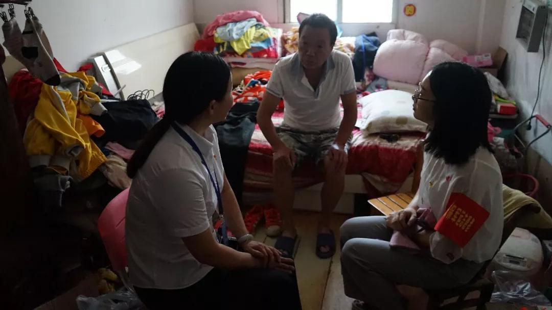 武汉科技馆一支部书记丁燕(左)与困难群众陈汉元(中)拉家常