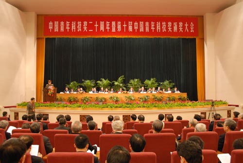 中国青年科技奖20周年暨第十届中国青年科技奖颁奖大会于12月28日上午在人民大会堂隆重举行。中共中央政治局委员、全国人大常委会副委员长王兆国,中共中央政治局委员、中央书记处书记、中央组织部部长李源潮,全国人大常委会副委员长、中国科协主席韩启德,国务委员陈至立,全国政协副主席、中国工程院院长徐匡迪,中国科协名誉主席周光召等为获奖者颁奖。李源潮发表讲话。