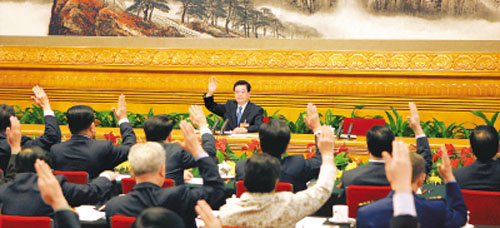 10月14日,中国共产党第十七次全国代表大会主席团在北京人民大会堂举行第一次会议。胡锦涛同志出席会议并作了重要讲话。新华社记者 兰红光摄
