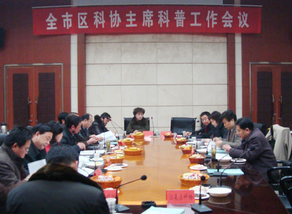 09年1月18日,召开“全市区科协主席科普工作会议”,全市13个城区科协主席、市科协机关各部室负责人参加了会议。会议由市科协副主席万立生主持,市科协副主席杨军对2008年全市科协系统的科普工作作了总结。会上,各区科协主席将本区08年工作的情况及09年工作计划作了交流。最后,市科协党组书记、主席卢光发作了重要讲话。