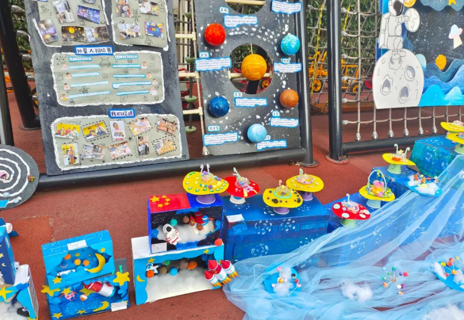 科学探索,创意无限。本次活动践行绿色环保理念,可循环利用的废旧材料通过巧妙地开发、创新、组合,就能实现幼儿们超能力的想象。航天航空航海主题模型“项目路演”现场,小朋友们亲自上阵解说自己和团队的作品,旧彩笔和乐高零件做的“宇宙火箭”,旧保安岗亭办公椅和各类旧厨具打造的设施设备齐全的“国际空间站”,矿泉水瓶薯片桶版的“智能机器人”,橡皮泥版的“宇宙星系”,大白防护服改造的“航天服”等。废旧物制作的每一件作品都独一无二。