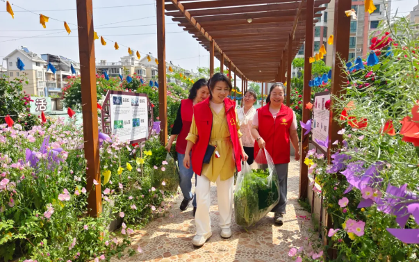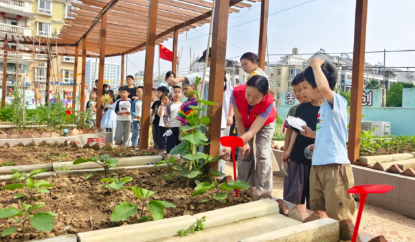 菜园里,嫩绿的黄瓜藤顺竿而上,茄子花、葫芦花朵朵娇艳,孩子们穿梭在花丛与菜畦之间,闻闻花香,摸摸绿叶,和社区志愿者们共同采摘了一大袋的芹菜,并送往将军路幸福食堂,感受劳动成果分享的快乐。