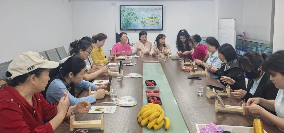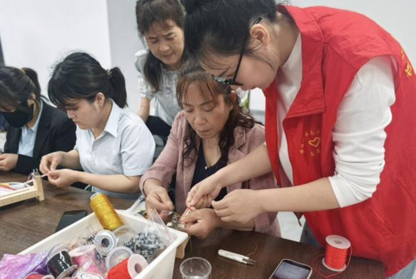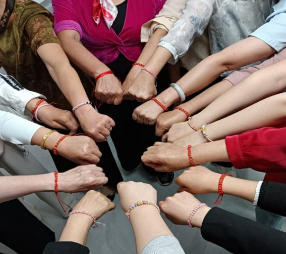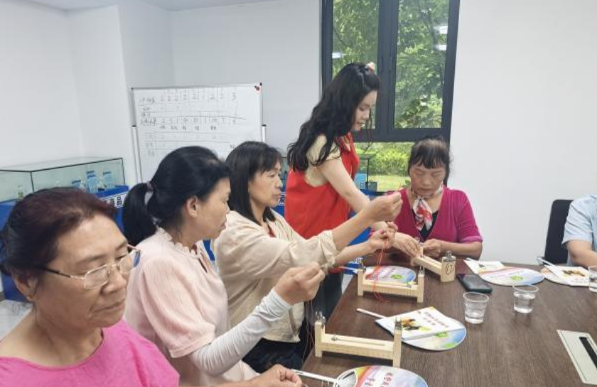 最后,科普志愿者邀请参与活动的老年群体一起编织红绳手串,制作时,大家一边分享着彼此的老年生活,一边交流着怎样将红绳编织得更美观,脸上洋溢着幸福的笑容。