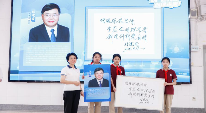 中国科学院桂建芳院士担任“碳探少年科学院”首席科学家,他寄语碳探武昌伢:“生态文明担当者,科技创新爱国情”。联合国教科文组织中国可持续发展教育秘书长王巧玲博士视频致辞,武汉市武昌区科学技术协会副主席朱大贤致辞,并为碳探少年科学院首席科学家桂建芳院士题词揭幕。