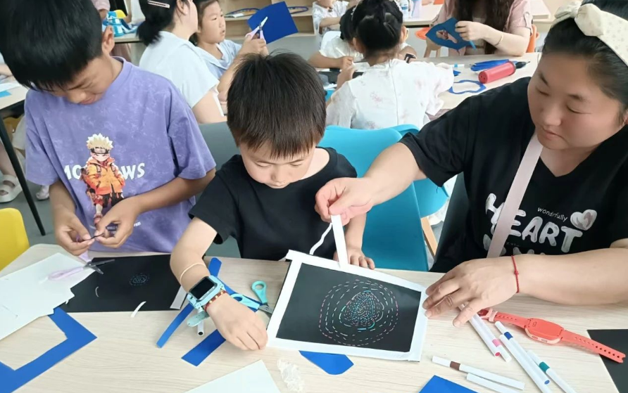 在郭老师主持的手工创作环节,活动达到了高潮。孩子们拿起彩色铅笔、水彩笔,在家长的陪伴与协助下,尽情发挥想象力,认真绘制心中的太阳系、星座和黑洞。一些孩子创作出了色彩斑斓的星座图案,而另一些孩子则将黑洞的神秘描绘得淋漓尽致。