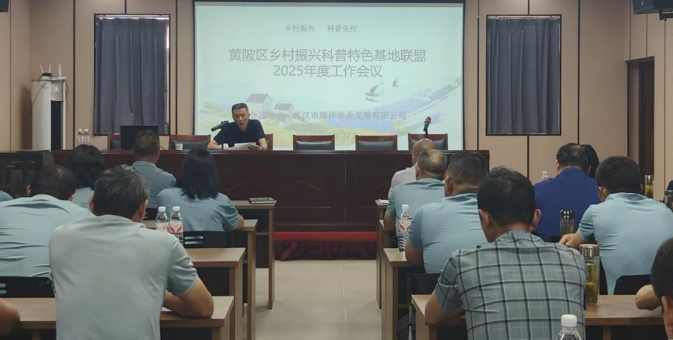 5月27日,黄陂区乡村振兴科普特色基地联盟2025年工作会议在武汉市鹿祥农业发展有限公司召开。区科协党组书记刘俊文,党组成员、副主席陈辉进、胡祺娟,全体联盟成员单位负责人参加会议。