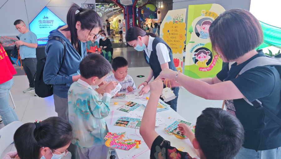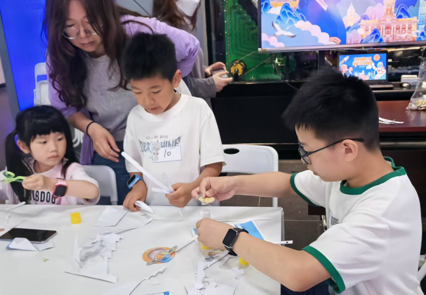 端午节当天,“诗话端午,共探非遗”主题活动吸引了现场小观众踊跃参与。活动现场,科普辅导员带领大家了解端午节的起源、风俗和饮食,并将以端午节为主题的古诗词串联起来,通过诗词品读的形式,让青少年深度体会中国传统文化的内涵。在DIY非遗龙舟灯活动环节,孩子们更是兴致勃勃,跃跃欲试。只见大家通过折叠、穿插、拼接等方式,将印有龙舟图案的纸板、细绳、灯泡巧妙组装后,一个个带有节日氛围的龙舟灯就灵动地呈现出来。