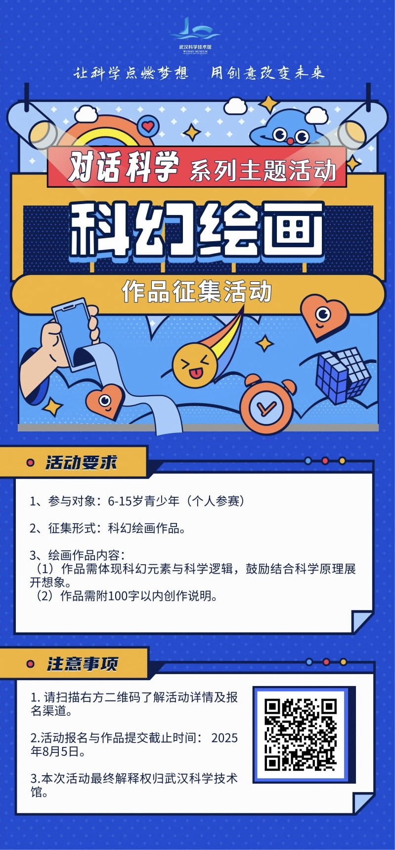为充分激发青少年对科学的兴趣与热爱,发挥青少年科学创意,武汉科技馆在暑期推出“对话科学”系列科普主题活动,面向全社会6-15岁青少年公开征集科普视频和科幻绘画作品。无论你是热爱讲解的“科学小达人”,还是充满幻想的“未来艺术家”,这里都为你提供展示才华的舞台!
