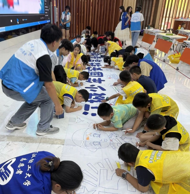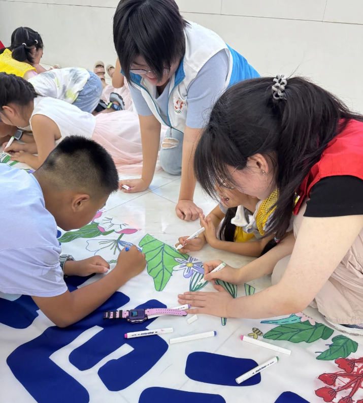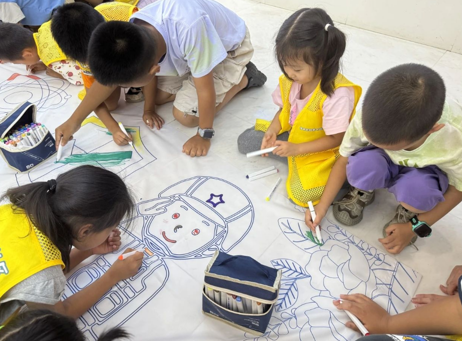 常青花园第七社区暑期托管班利用常青花园国家安全综观馆作为暑期托管场地,既实现了场地复用,又在潜移默化中引导青少年树立践行总体国家安全观的意识。暑期托管班的 40 余名小朋友在东西湖区常青花园国家安全主题园正合力创作国安主题长卷,“小画家” 们围着 10米长的画布忙碌起来:有的蹲在地上细细勾勒长城轮廓,有的踮着脚尖给天安门涂上红色 “城墙”。