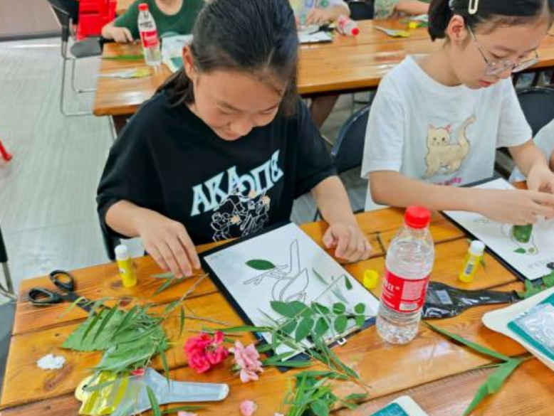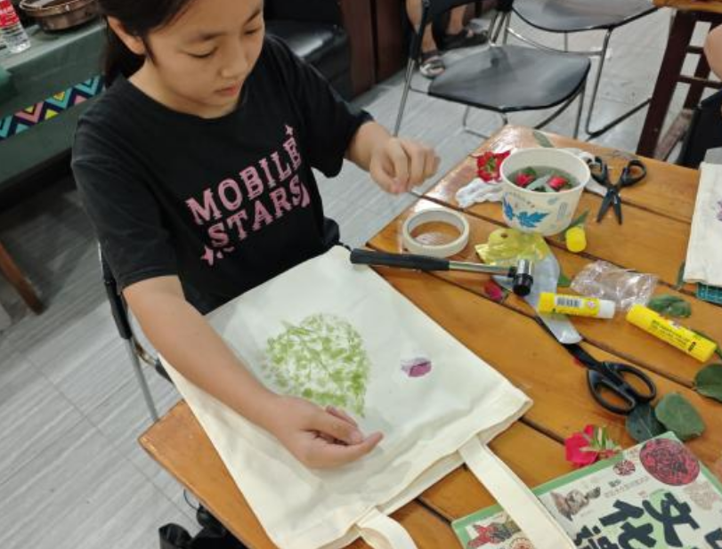 压轴的拓印DIY环节里,孩子们用寻来的叶片创作:固定叶片、轻敲拓印,脉络纹路渐次显现在帆布包上。在指导下,有人拼贴叶片组合图案,有人搭配色彩点缀,一件件带着自然印记的作品新鲜出炉,成就感溢于言表。