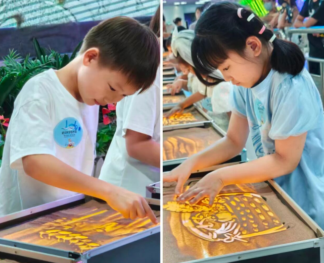欣赏和学习了关于无线充电的科学知识,沙画体验是现场观众最期待的环节,未来的小小沙画师积极加入到创作体验中,纷纷尝试用手中的细沙描绘看到过的最美烟花和秋天丰收的麦穗。