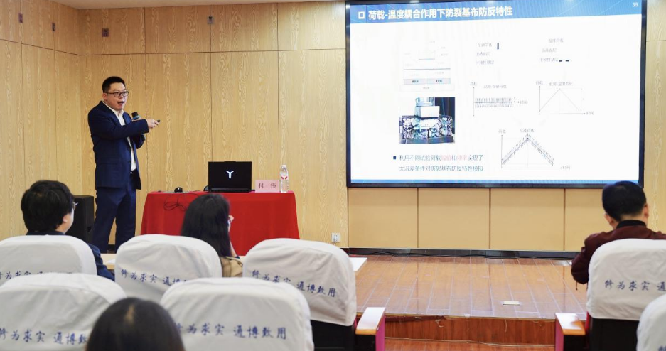 “我们经常可以看到恶劣气候条件下路面平均每3米~5米就有一条裂缝,养护工人反复灌缝却治标不治本。”付伟指着沥青路面反射裂缝的照片,语气凝重。为解决这个难题,他带领团队从“能不能用土工织物防裂”的疑问开始,通过多尺度试验:小尺度MTS疲劳试验验证材料性能,1/3尺寸路面模型做54万次加速加载,再在川藏公路修1.7公里试验段进行11年连续观测。“我在PPT里列的聚丙烯长丝土工织物技术指标,每一个数据都来自上百次试验——克重120g/m²~160g/m²、拉伸强度≥9kN/m,哪怕是吸油率≥1.2kg/m²这样的细节,都要反复验证。聚酯材料在碱性环境下3个月就会老化,而聚丙烯材料能稳定工作,这个结论我们用电子显微镜观察了无数次才敢确定。”这种“打破砂锅问到底”的执着,正是“追求真理、严谨治学”求实精神的生动写照。
