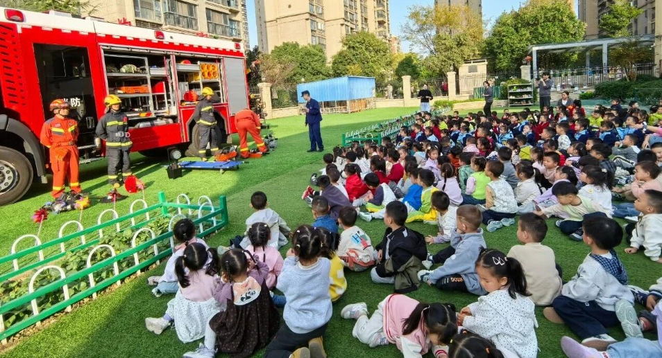 随后,中大班幼儿转移到八角亭参加消防安全知识培训。三店消防救援站的消防员以生动有趣的方式,为孩子们讲解防火常识和自救要点。孩子们围着消防员,眼中充满好奇与敬佩。活动最后,幼儿园还向消防救援站赠送锦旗,红色的缎带在阳光下格外鲜艳。
