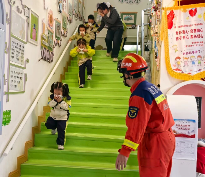 楼梯转角处,保育员和行政人员早已就位,张开双臂守护着每一个经过的孩子。“别怕,跟着老师”“弯着腰,捂住口鼻”,老师们温柔而坚定的声音在走廊里回荡。孩子们虽然紧张,却保持着良好的秩序,小小的身影在老师护送下顺利通过各个疏散点。