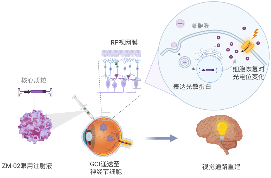 项目为中眸医疗的主推管线ZM-02,基于光遗传学自主研发,通过独特的光敏蛋白平台筛选出世界领先的高效光敏蛋白,突破了光遗传技术在临床自然光环境应用的瓶颈。该技术不区分基因型,可涵盖超过一百余种基因突变类型。采用安全的腺相关病毒递送基因药物,经玻璃体腔注射后,光敏蛋白在未退化的视网膜细胞表达并定位于细胞膜,使退化后不能感光的视网膜重建对光反应。ZM-02管线的首批First-in-human临床实验已顺利开展,所有给药患者的视力显著提升,未见明显不良反应。目前部分患者已治疗一年,视力仍在持续提升。ZM-02管线已完成工艺开发和临床前毒理实验,当前处于中美IND申报阶段。公司累计研发投入1000多万,已获得中国、美国等8项专利授权。