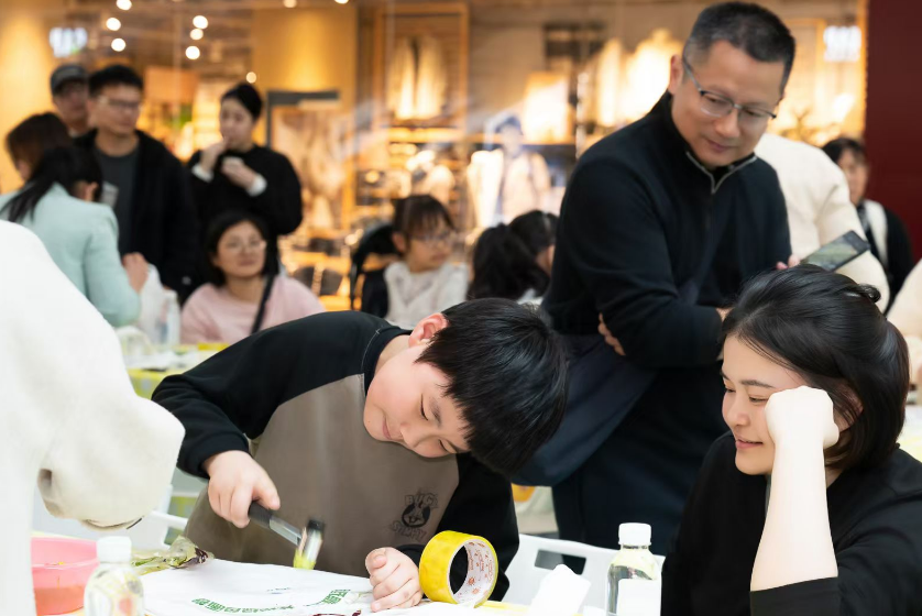 科普环节结束后,植物拓印工坊成为活动“人气打卡点”。孩子们手持安全锤,将植物纹理、花朵色彩小心翼翼地拓印在帆布包上,家长在旁协助调整角度,原本空白的帆布包瞬间变成独一无二的“自然艺术品”。“拓印帆布包比买现成的玩具更有意义,既能锻炼动手能力,又能让孩子明白美来自于大自然。”一位参与家长感慨道。活动结束后,这些拓印作品均可由家庭自行带回循环使用,进一步推动 “生物多样性保护”和“低碳生活”的“无废”理念融入家庭场景。