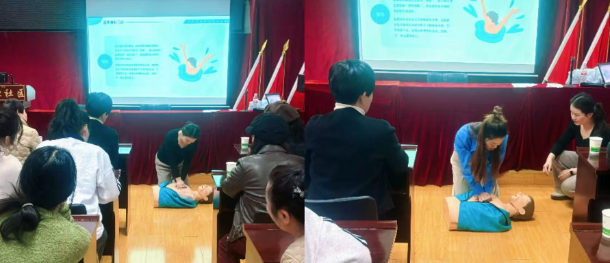实操体验:老师讲解示范后,社区居民们分组在模拟人身上反复练习心肺复苏的按压频率与深度、海姆立克急救法的“剪刀—石头—布”操作要领,一对一指导确保动作规范。