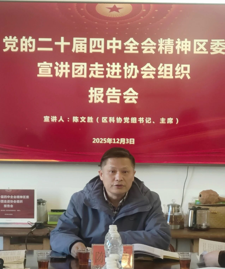报告会上,陈文胜围绕党的二十届四中全会有关会议情况、深刻认识党的二十届四中全会的重大意义、准确把握“十五五”时期重要地位、深刻领会“十五五”时期经济社会发展的指导方针、主要目标、全面理解“十五五”的战略任务与重大举措、坚持和加强党的全面领导五个方面,结合我区实际和协会经济发展,对党的二十届四中全会精神进行了系统深入讲解。