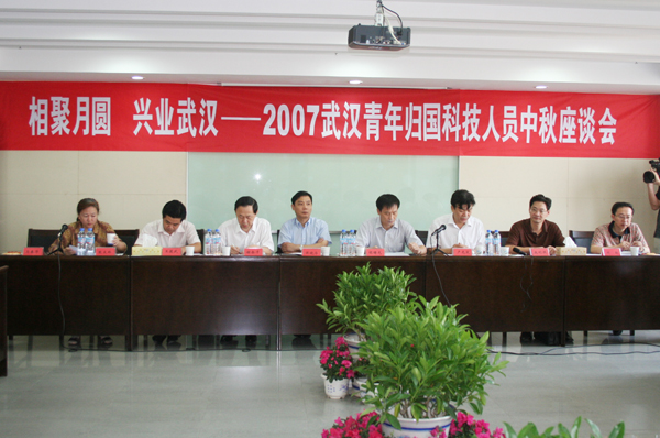 金风送爽,月桂飘香。在中秋节到来之际,、武汉市侨联、团市委于9月21日联合召开相聚月圆,兴业武汉 2007武汉青年归国科技工作者座谈会。市委副书记胡曙光,市政协副主席侯晓华,市科协党组书记、主席卢光发,市侨联党组书记、主席谢余卡,团市委副书记王筱武、市人事局副局长赵利洪等领导与我市青年归国科技工作者代表欢聚一堂,庆祝佳节,畅谈我市科技事业发展。