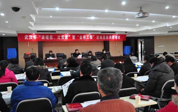 1月11日下午,2009-2010年度武汉市“讲理想、比贡献”和“金桥工程”活动总结表彰会议隆重召开。会议由市科协企事业部部长宋卫华主持。会上,副主席张太玲宣读《关于表彰2009-2010年度武汉市“讲理想、比贡献”和“金桥工程”活动先进集体、优秀项目、科技标兵、优秀组织者的决定》。市科协副主席杨军宣读《关于开展“讲理想、比贡献”及“金桥工程”活动的宣传方案》。获奖单位和个人代表分别发言。