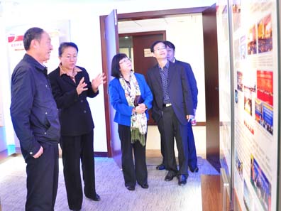 武汉科协副主席张太玲(左二)向许振超常委(左一)、刘莉主任(左三)介绍的工作开展情况。