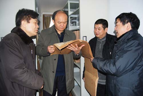 市科技局局长吴志振(左二)在市科协主席卢光发(左一)、副主席陈光勇(右一)及报社总编辑陈海涛的陪同下翻阅武汉科技报创刊号。