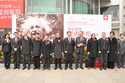 武汉市政府副市长邢早忠,瑞士驻华大使顾博礼、武汉市政府副秘书长陈新垓,中国科学院院士叶朝辉,湖北省科协副主席许晓金,主席卢光发,瑞士科技教育参赞贺满崐,瑞士伯尔尼历史博物馆馆长以及市直机关工委、市外办、团市委、教育局等主办单位负责人,瑞士联邦政府科技中心有关负责人等200多人参加了开幕式。爱因斯坦曾孙——保罗·爱因斯坦也参加了开幕式,并在武汉演出音乐剧,为展览献礼。