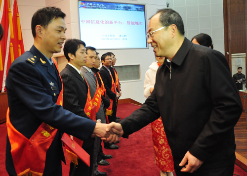 中国工程院常务副院长潘云鹤院士,省委常委、市委书记阮成发为获奖的20名优秀科技工作者颁奖。