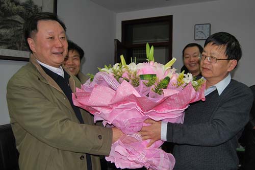 武汉市副市长邢早忠一行看望慰问中国科学院院士赵进东。图为邢早忠副市长(左一)代表市委市政府向赵进东院士(右一)送上鲜花和新春的祝福