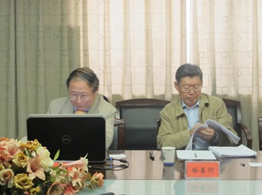 中国自然科学博物馆协会名誉理事长徐善衍(右)、原中国自然科学博物馆协会秘书长邵杰(左)在审查会上听取展示内容的汇报。