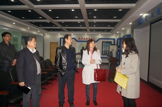 武汉科技馆馆长马华(左一)一行参观机器人研发工作室