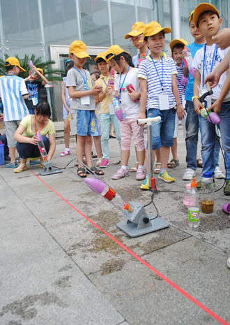 小营员们玩自己制造的水火箭