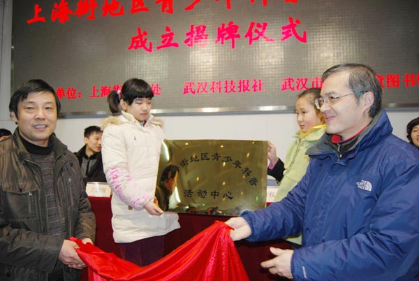 黄智部长与武汉市少年儿童图书馆馆长陈方权为上海街地区青少年科普活动中心成立揭牌。